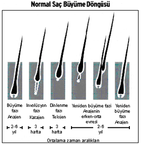 The HAIR life cycle consists of 3 phases: anagen (active growth), categen (transition), and telogen (resting). The anagen phase lasts about 1000 days, the categen phase a few weeks, and the telogen phase about 100 days. At any given time, 5-10% of the hair is in the telogen phase. Thousands of different hair follicles on the scalp are in different stages at any given time.